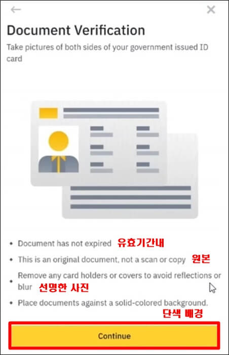 그러면 영문으로 1) 유효기간 내에 2) 사본이 아닌 3) 정보를 가리지 않은 4) 단색 배경에서 신분증을 촬영해 달라는 문구가 나옵니다. 확인하고 'Continue' 클릭합니다.