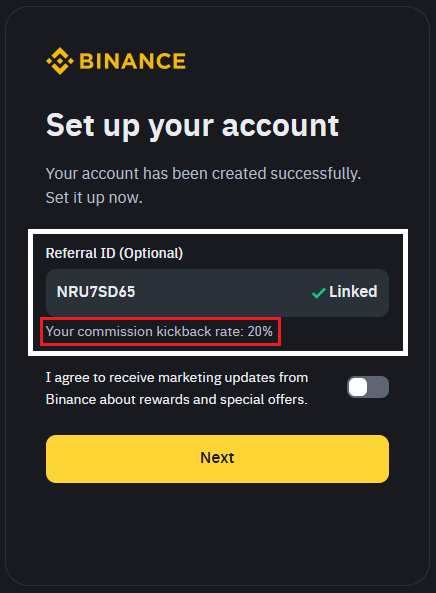 그러면 계정 생성 확인(Account Created) 창이 나옵니다. 여기서 "Your commission kickback rate : 20%" 문구를 확인합니다. 0% 또는 10% 라고 적혀있으면 링크를 잘 못 타고 들어온 겁니다. 최대 20% 적용이 되었는지 확인합니다. (레퍼럴 아이디 "NRU7SD65" 확인) 그 다음 아래에 마케팅 동의는 체크하지 말고 'Next' 버튼을 클릭합니다.
