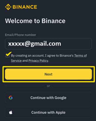 1. 접속 후 이메일 또는 휴대폰 번호를 입력하고, 아래쪽에 약관 동의를 체크한 후 'Next' 버튼을 클릭합니다. 'Continue with Google' 또는 'Continue with Apple' 버튼을 사용하여 가입하지 않도록 주의해주세요. 이러한 방법으로 가입하면 수수료 할인이 적용되지 않는 경우가 있습니다.