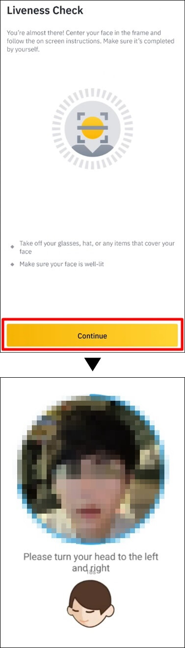 이제 셀카 촬영을 해보겠습니다. 'Continue' 클릭합니다. 프레임에 얼굴을 대고 시키는 대로 합니다. 1) 입을 뻐끔거려라, 2) 윙크해라 3) 고개를 좌우로 돌려라 등을 시킵니다.