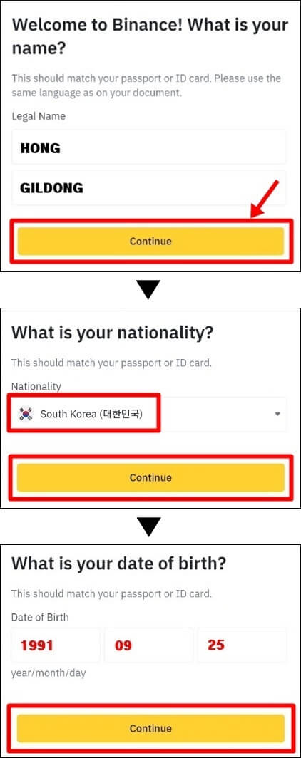 이어서 이름과 성을 입력하고 'Continue' 버튼을 클릭합니다. 그다음 국적을 'South Korea'(대한민국)로 선택하고 'Continue' 클릭 후, 생년월일(Date of Birth)을 넣고 'Continue' 클릭합니다.