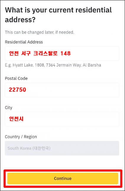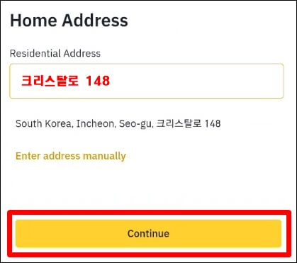 이어서 도로명 주소를 입력하고, 자동완성 되는 주소를 누르고 'Continue' 버튼을 클릭하면, 우편 번호 등 나머지 정보를 입력해 줍니다. 자동 완성이 안될 경우 그냥 'Continue' 누르고 수동으로 입력해 주셔도 됩니다.