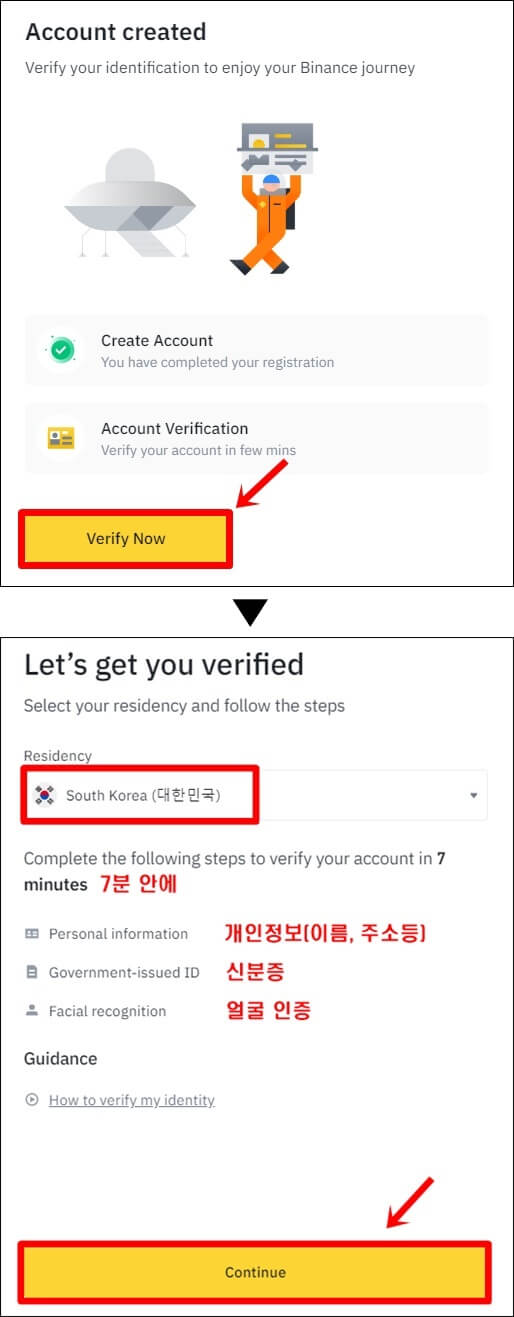 이어서 조금전에 가입한 아이디로 로그인하면 자동으로 아래와 같은 창이 나옵니다. 'Verify Now'를 눌러서 KYC 본인 인증을 시작해 줍니다. 이어서 창이 바뀌면 국적 부분을 'South Korea'로 선택하고 'Continue' 클릭합니다.