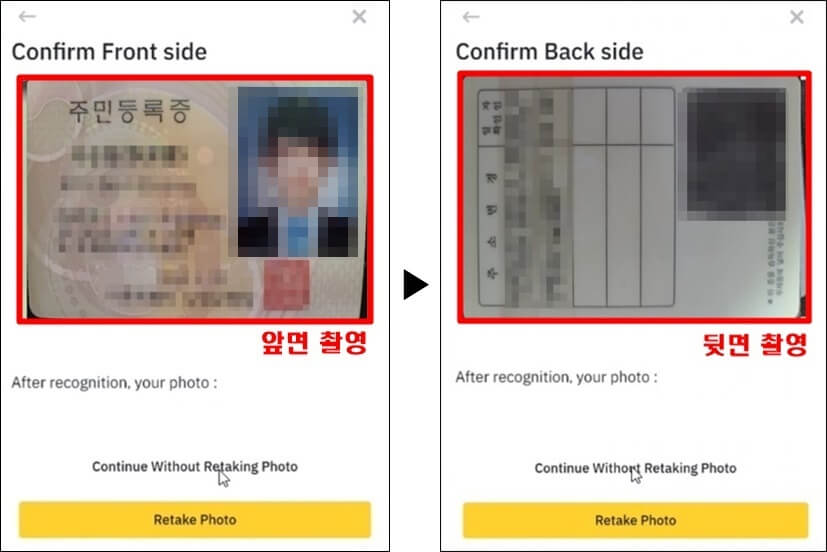 그다음 신분증 앞면 사진을 찍고 기다리면 촬영이 완료되고, 곧바로 뒷면 사진도 촬영 후 업로드합니다. 그다음 'Document uploaded'(서류 업로드 완료) 문구를 확인하고 'Continue'를 눌러 넘어갑니다.